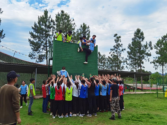 拓展的最后环节,5支队伍重新集结,融合为大团队,挑战45分钟全员穿越4.2米高墙。八名同伴,甘做基石,用他们的付出,托起整个团队翻越的希望。