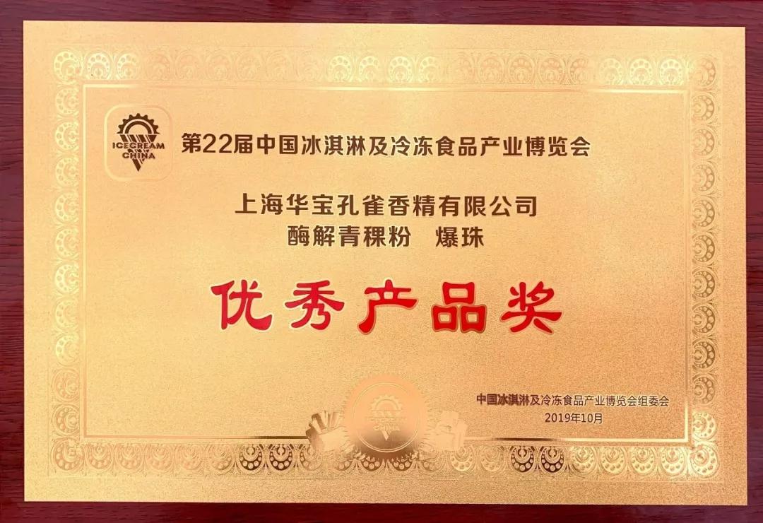在本次行业年会举办的第22届中国冰淇淋及冷冻食品产业博览会优秀产品颁奖仪式中,上海壹号娱乐 孔雀香精有限公司凭借酶解青稞粉、食用爆珠荣获优秀产品奖。酶解青稞粉(原味)是选用产自青藏高原海拔3000米以上的有机白青稞为原料进行复配测试,通过多级均质、喷雾干燥等工艺制成,具有风味纯正、香气自然、口感清爽、配伍性好等特点。食用爆珠是由卡拉胶、阿拉伯胶、塔拉胶、瓜尔豆胶等成分组合而成,并运用同心滴制法生产方式,爆珠滴制冷却柱的高度可以调节,通过调节高度,实现调节爆珠的大小。
