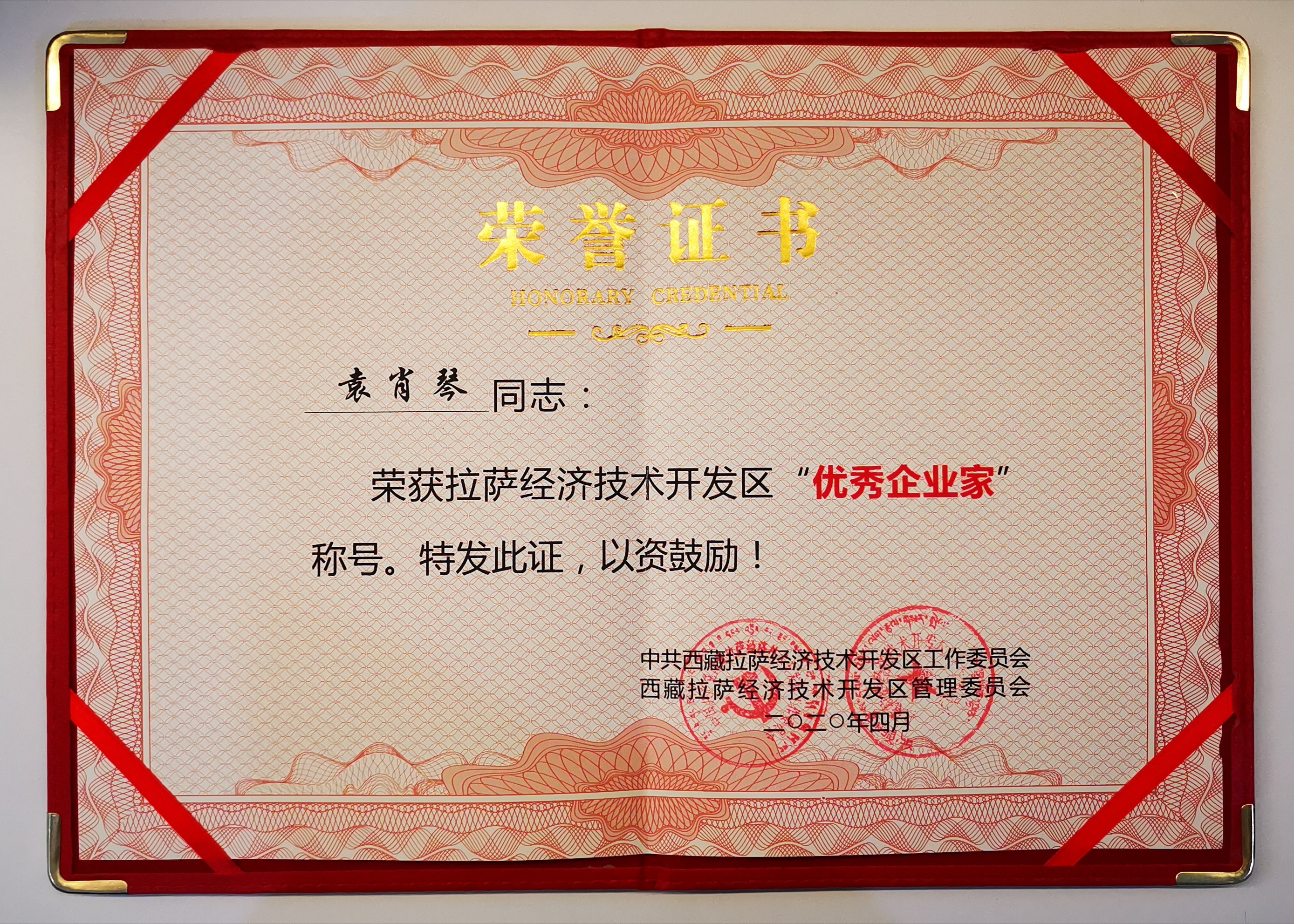近日,壹号娱乐 股份喜事连连,公司再获中共西藏拉萨经济技术开发区工作委员会、西藏拉萨经济技术开发区管理委员会颁发的拉萨经济开发区开放发展“优秀企业”奖,公司董事、总裁袁肖琴女士荣获拉萨经济技术开发区“优秀企业家”称号。