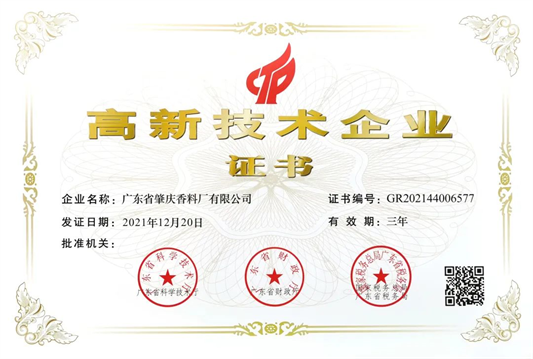 日前,肇庆香料厂传来喜讯,企业顺利通过国家级高新技术企业的再次认定,证书编号GR202144006577。