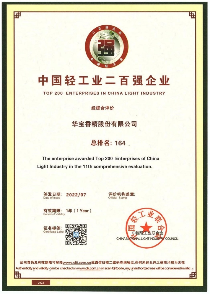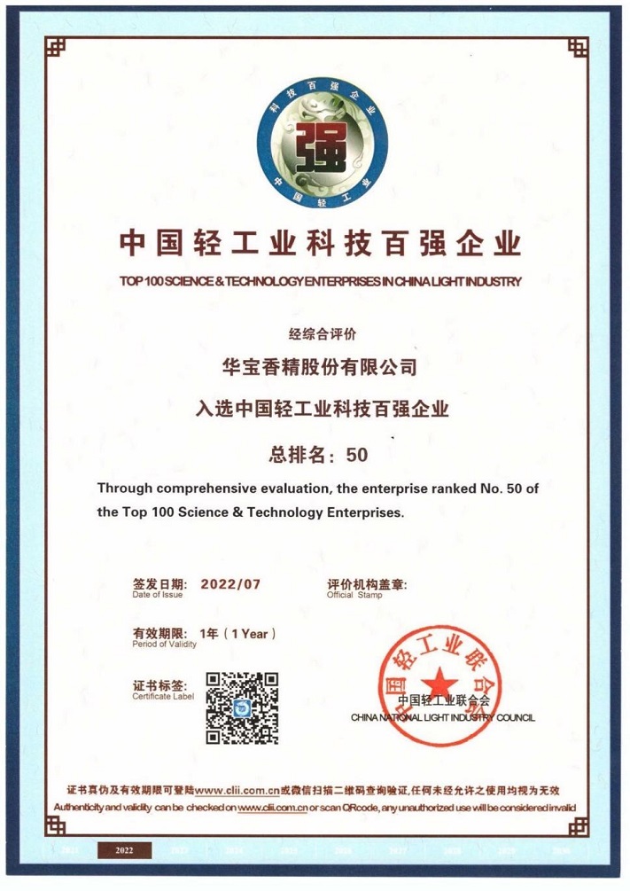 2021年,壹号娱乐 股份荣登中国轻工业二百强企业和中国轻工业科技百强企业榜单,同时位列中国香精行业十强企业之首;2020年,壹号娱乐 股份荣登中国轻工业百强企业综合榜单;2019年,公司荣登中国轻工业科技百强企业榜单,同时位列中国香精行业十强企业之首。此次再次荣获两项荣誉是对壹号娱乐 股份在创新驱动、数字转型、服务民生及国际化布局方面所取得成效的赞许与鼓励,是壹号娱乐 股份综合实力和强大科技创新能力的体现。